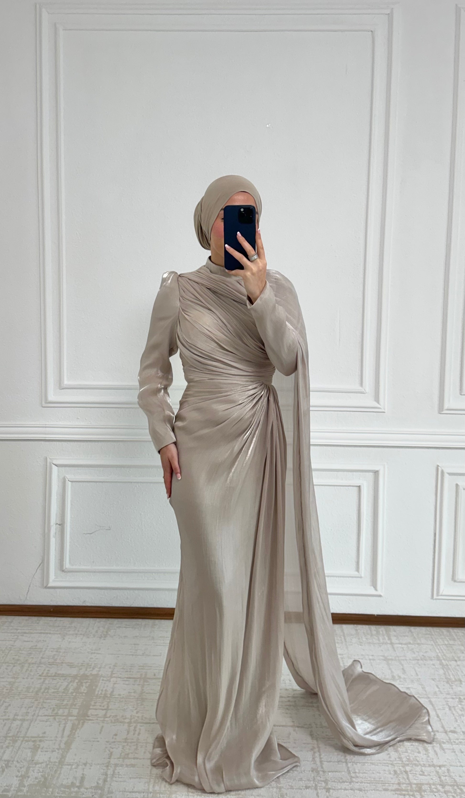 Elegantes, langes Abendkleid in Beige mit fließendem Stoff und edler Drapierung. Figurschmeichelnder Schnitt, hochgeschlossen, langärmelig und mit seitlichem Schal – ideal für Hochzeiten und festliche Anlässe.
